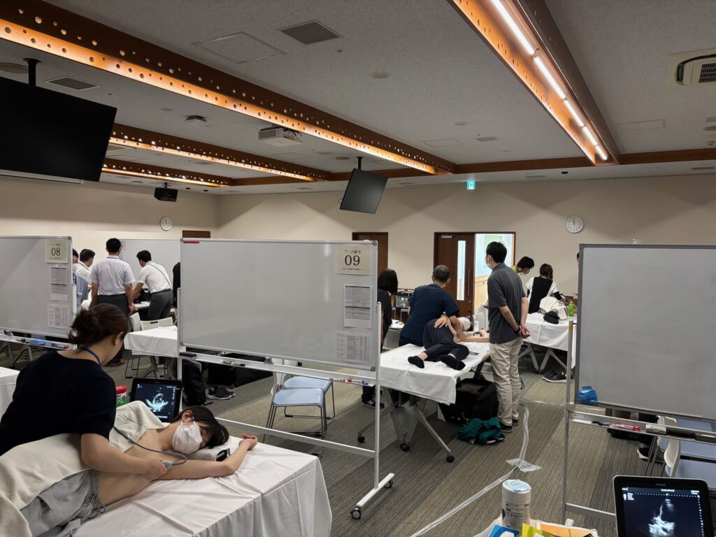 参加者の多くは医師ですが、NPや特定看護師の参加も1/3ほどありました。医師だけでなく看護師の皆さんにも着実にエコーの広がりを感じます。今回の私の担当が特定看護師の皆さんだったのですが、エコーを頻繁にしていたり、まったく初めてなど経験は様々でした。皆さん一生懸命に実技を習得しようと熱心に取り組んでいらっしゃいました。指導の終わりごろに、自施設に戻ったら絶対にエコーやります!と言っていただけたのが嬉しかったです。